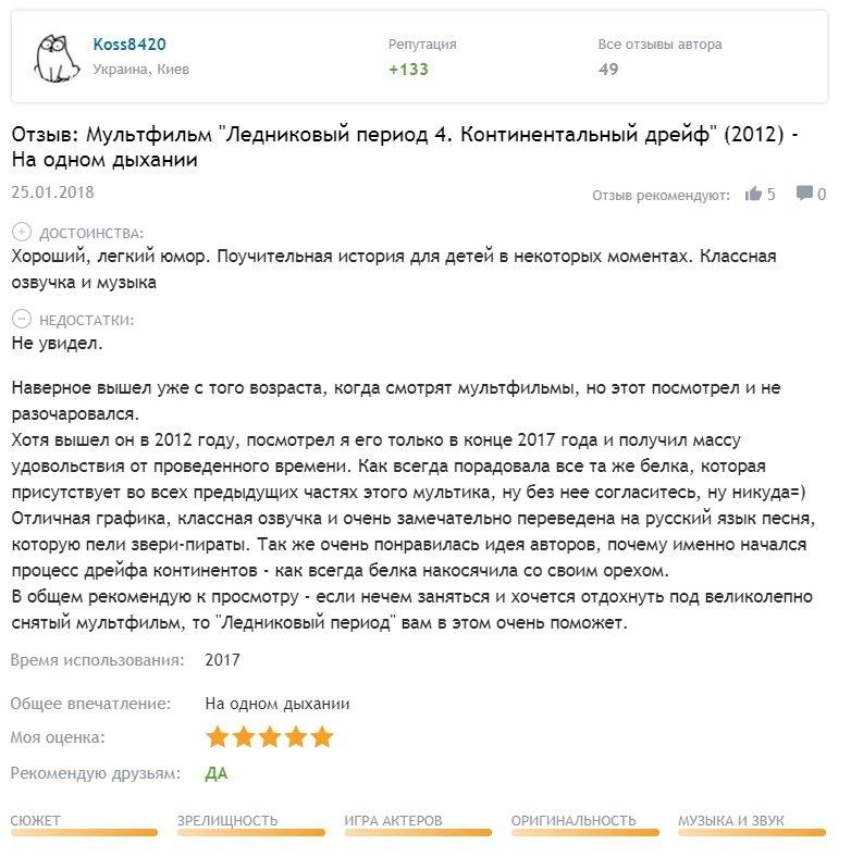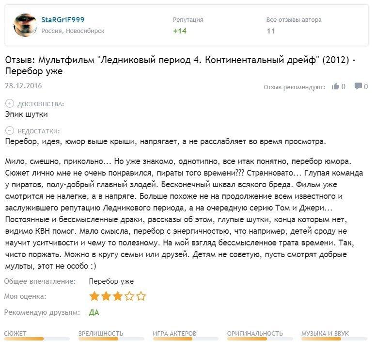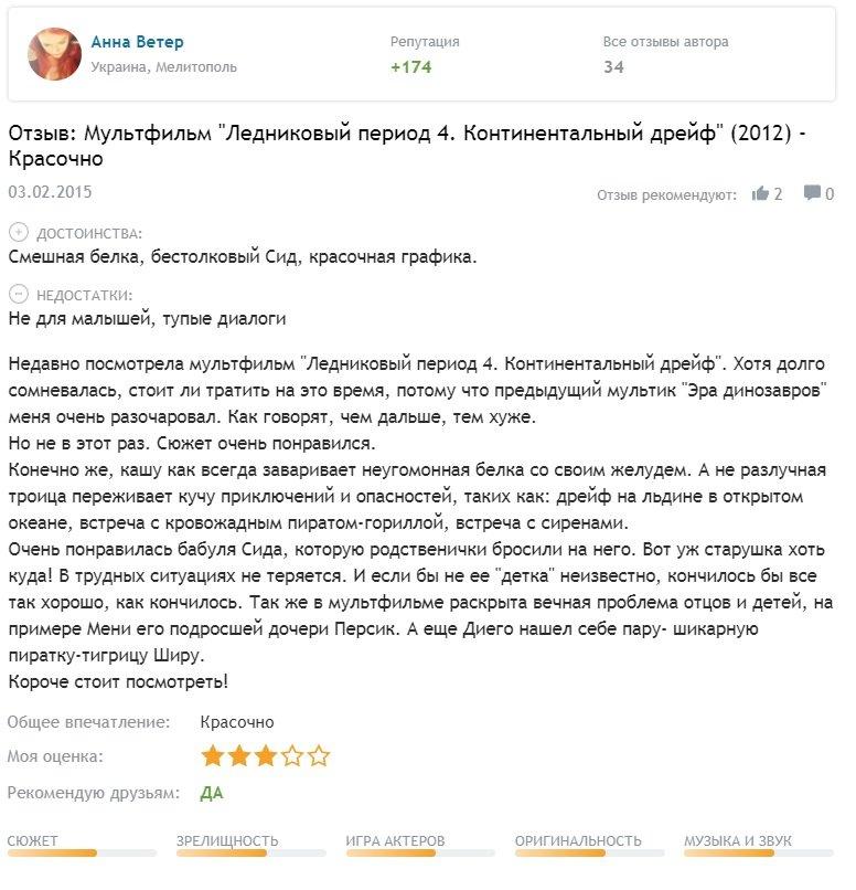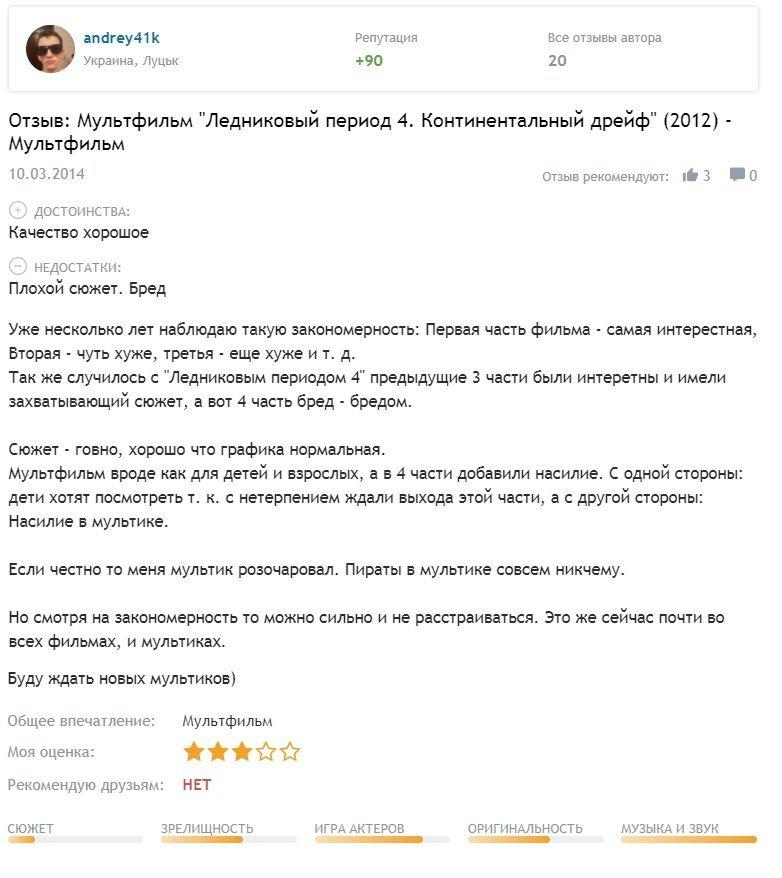Но его негативные ожидания в сторону данного мультфильма не оправдались. Посмотрев его мужчина отметил то, что «Ледниковый период» заставил его действительно испытать массу самых положительных и веселых эмоций. От этой кинокартины по-настоящему улыбается душа и радуется сердце.